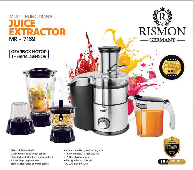 آبمیوه گیری 4 کاره ریسمون آلمان مدل MR-7169، همراه همیشگی شما برای نوشیدنیهای سالم و تازه! با قدرت بالا و عملکرد چندگانه، این دستگاه به شما امکان آبگیری، خرد کردن و مخلوط کردن را میدهد. طراحی زیبا و کاربری آسان آن، تضمینی برای تجربهای لذتبخش در آشپزخانه است. همین حالا خرید کنید و سلامتی را به خانه بیاورید!